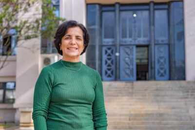 Patricia Aniz em frente ao prédio onde está localizado o Laboratório de Bacteriologia