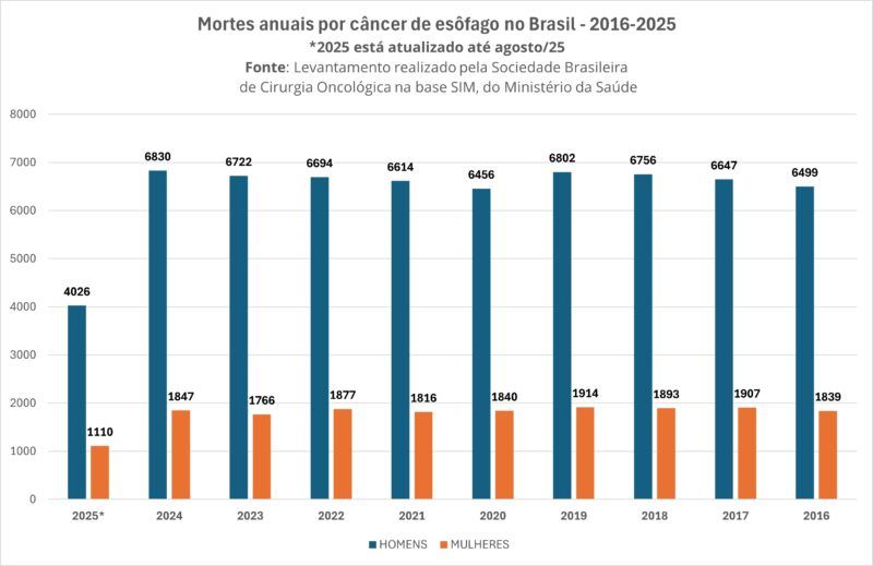 Dados levantados em março de 2026 pela Sociedade Brasileira de Cirurgia Oncológica (SBCO) na base do Sistema de Informações sobre Mortalidade (SIM), do Ministério da Saúde, mostram que o câncer de esôfago causou 8.677 mortes em 2024, sendo 6.830 entre homens e 1.847 entre mulheres. Esse padrão, segundo a entidade, reflete maior exposição do público masculino a fatores de risco ao longo da vida, especialmente aqueles relacionados ao consumo de álcool e ao tabagismo, que tendem a se acumular ao longo dos anos. Ainda de acordo com os dados do SIM, houve aumento no número de mortes nos últimos anos.
