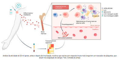 As plaquetas, fragmentos de células que atuam na coagulação do sangue, podem estar associadas a uma resposta imune longa e persistente das vacinas, revela estudo internacional com participação brasileira. Através de análises de expressão genética (transcritoma), experimentos com animais e culturas de células, os pesquisadores apontam que a resposta imune pode ser potencializada pelo hormônio TPO, produzido pelo fígado e pelos rins, que ativa a síntese de plaquetas, combinada com a ação das células B, produtoras de anticorpos.