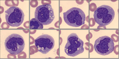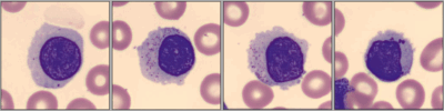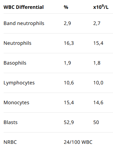 No software CellaVision® Remote Review, o analista de plantão pôde observar neutropenia com granulação tóxica, alguns linfócitos grandes granulares (LGLs), monócitos com aparência imatura e um número elevado de eritroblastos (NRBC) em diferentes estágios de maturação e com características displásicas. Ela também pôde observar um grande número de células imaturas grandes, com núcleos semelhantes aos de blastos, apresentando um ou mais nucléolos, citoplasma basofílico abundante com grânulos azurófilos finamente distribuídos e vacuolização. Algumas dessas células imaturas apresentavam núcleos dobrados e convolutos, com uma estrutura de cromatina delicada em forma de renda, e citoplasma azul acinzentado com grânulos azurófilos e vacúolos.