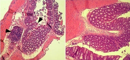 Em experimento, a inibição da prostaglandina E2 levou a um aumento na migração de células de defesa e produção de peptídeos antimicrobianos, resultando na redução da carga bacteriana no ambiente intestinal (imagem: comparação entre cortes microscópicos do tecido do cólon distal de ratos com infecção por C. rodentium e de ratos tratados com indometacina/ PNAS)