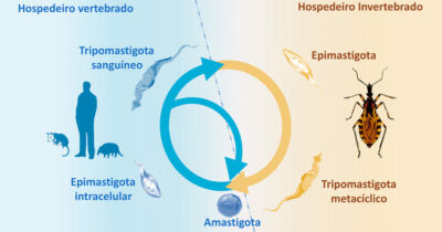 Ciclo de vida do Trypanosoma cruzi, causador da doença de Chagas, entre os hospedeiros (inseto e humano), indicando os estágios de desenvolvimento do parasita – Imagem: Cedida pelo pesquisador Mayke Alencar
