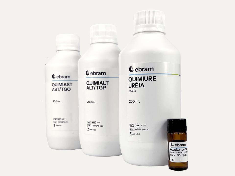 A linha de bioquímica da Ebram possui reagentes líquidos e prontos para uso, desenvolvidos para tornar a rotina do laboratório mais simples e segura. Seu principal diferencial é oferecer a maior quantidade de reagentes no formato monorreagente do mercado. Dos 29 reagentes da linha, 16 são oferecidos nesse formato, e entre eles se destacam AST/TGO, ALT/TGP e Ureia, fornecidos com exclusividade pela Ebram.