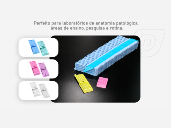Com a finalidade de manter os tecidos seguros quando submetidos às histotécnicas, os laboratórios de anatomia patológica utilizam cassetes plásticos, feitos de termoplástico resistente (POM – polióxido de metileno), coloridos e perfurados para facilitar as trocas de soluções durante os processos. Esses cassetes possuem uma área lisa para identificação da amostra que pode ser feita manualmente ou com uso de impressoras dedicadas que imprimem em ângulos de 30° ou 45°. As cores variadas são importantes para criar uma sistematização dentro do laboratório, seja pelo tipo de amostra, procedimento, data de entrada do material etc.