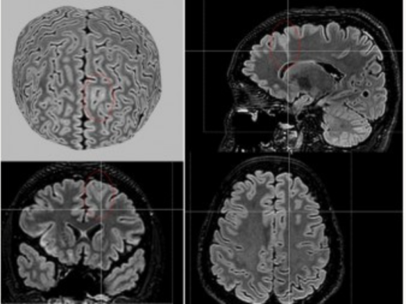Imagem – Reconstrução de imagem de ressonância magnética mostrando uma lesão sutil de displasia cortical focal (indicada pelo círculo vermelho) em criança com epilepsia refratária a medicamentos (crédito: Laboratório de Neuroimagem/BRAINN/Unicamp)