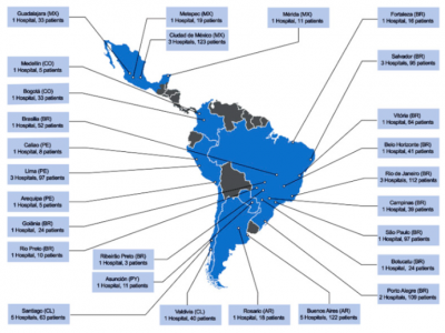 Mapa mostrando os centros médicos onde foram atendidos os pacientes analisados no estudo, nos sete países participantes: Argentina, Brasil, Chile, Colômbia, Paraguai, Peru e México (Imagem: extraída do artigo)
