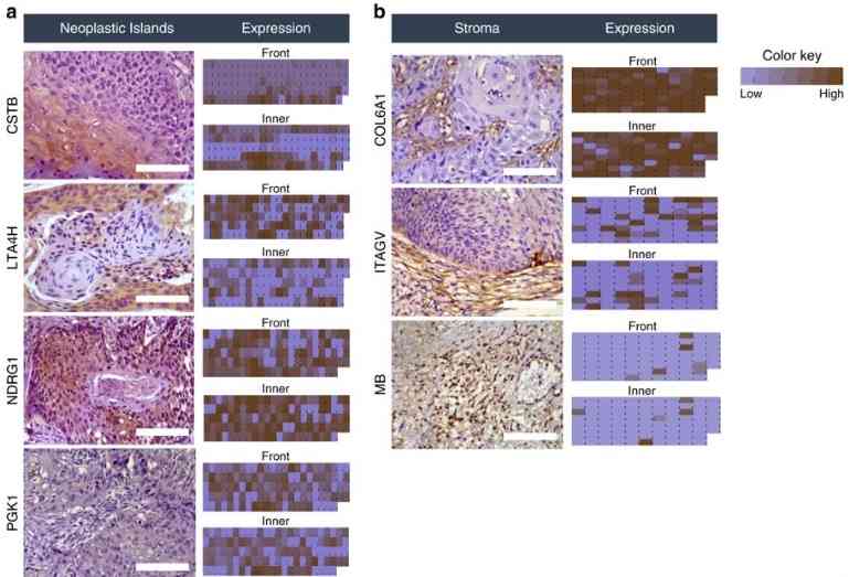 Na primeira fase, os pesquisadores mapearam por microdissecção a laser e proteômica as proteínas no tecido de câncer de boca e correlacionaram com as características clínicas dos pacientes. Essa avaliação permitiu a identificação de várias proteínas, tais como CSTB, NDRG1, LTA4H, PGK1, COL6A1, ITGAV e MB, com padrões de abundância distintos dependendo da área do tumor avaliada e associação com importantes desfechos clínicos.
