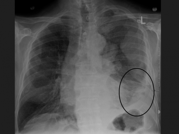 Imagem – Imagem de raio-X de tórax mostrando um mesotelioma pleural maligno (imagem: James Heilman, MD/Wikimedia Commons)