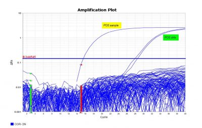 Figura 2. Curvas de amplificação para amostras de uma placa de 384 poços, com 2 controles positivos (destaque em verde) e uma amostra positiva (destaque em amarelo), e as amostras negativas ou controles negativos (curvas em azul de linha de base).