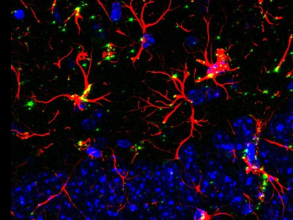 Imagem – Astrócitos, em vermelho, de hipocampo de roedores superexpressando hevina, em verde (imagem: Felipe Cabral-Miranda e Ana Paula Bergamo Araujo)