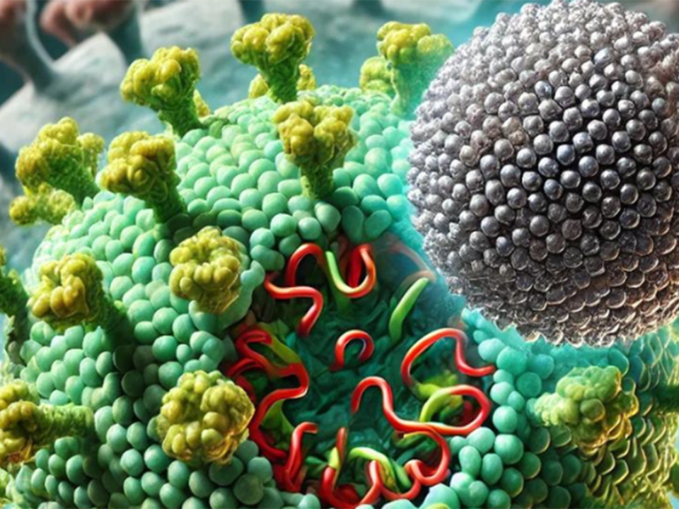 Imagem – As nanopartículas de prata interagem diretamente com a proteína spike diminuindo o potencial do vírus – Imagem: enviada pelo pesquisador, gerada por IA via FMRP USP
