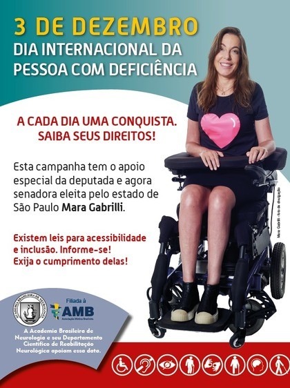 Com o apoio da Academia Brasileira de Neurologia e do Departamento Científico de Reabilitação Neurológica, destaca-se em 3 de dezembro o Dia Internacional da pessoa com deficiência. A data consta do calendário oficial da Organização das Nações Unidas (ONU) desde 1992