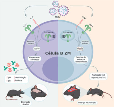 Foi verificado que, após o primeiro contato com o vírus Oropouche, ocorre a ativação de uma via de sinalização imunológica nos linfócitos B, regulada pela proteína MyD88, a qual é essencial para a diferenciação celular em secretoras de anticorpos e produção adequada de anticorpos neutralizantes contra esse patógeno. Com isso, essa via controla a infecção viral durante o curso da doença, e também é essencial para evitar a disseminação viral para o sistema nervoso central. – Eduardo Lani Volpe da Silveira