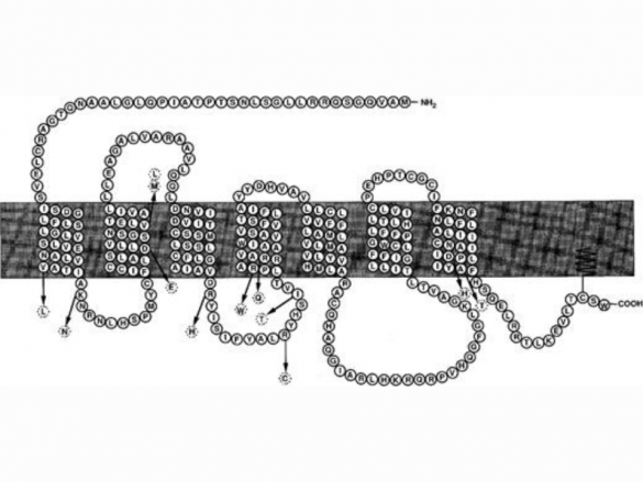 Imagem – Posição das mutações missense de aminoácidos na estrutura esquemática proposta da sequência de proteína MSHR humana de consenso descrita neste relatório. O aminoácido de substituição é destacado em círculos tracejados. Acredita-se que o resíduo de cisteína na posição 315 esteja covalentemente ligado ao ácido palmítico ( 17 )