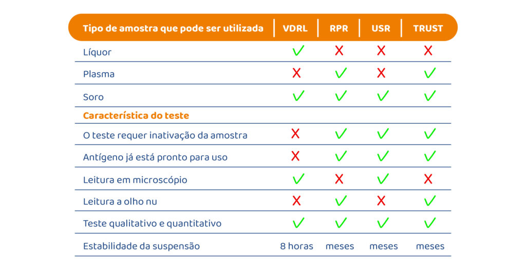 | Floculação | VDRL (Venereal Disease Research Laboratory) RPR (Rapid Test Reagin) USR (Unheated Serum Reagin) TRUST (Toluidine Red Unheated Serum Test) |