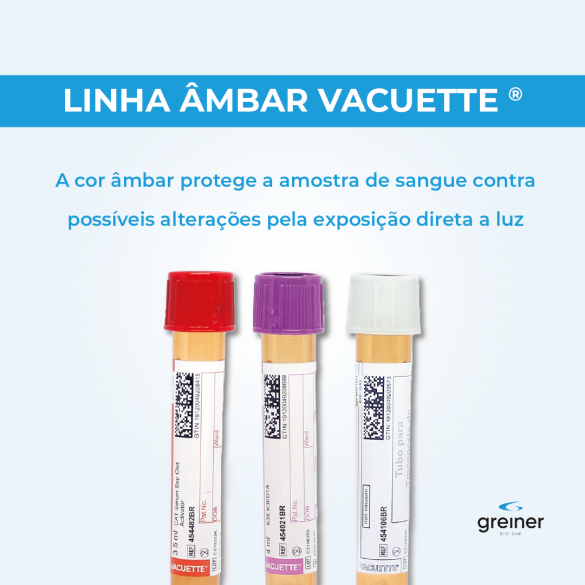 Desenvolvidos com exclusividade no Brasil, a linha Âmbar VACUETTE® é uma inovação em tubos de coleta. A cor âmbar protege as amostras de sangue da exposição à luz, garantindo a integridade dos resultados laboratoriais.